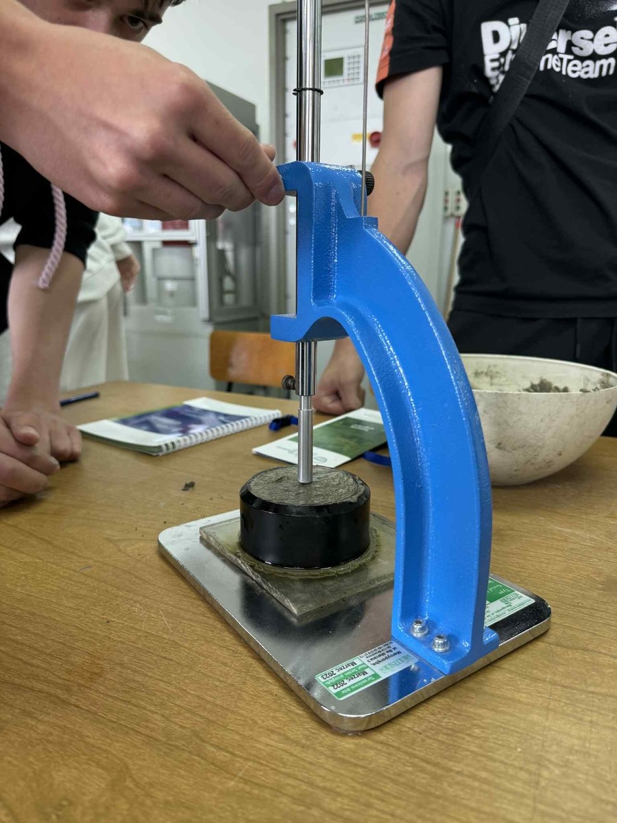 Na zakończenie uczniowie mieli możliwość zapoznać się z procedurą badania wytrzymałości na ściskanie próbek betonowych. Dzięki wykorzystaniu prasy wytrzymałościowej mogli na własne oczy zobaczyć, jak zachowuje się beton pod wpływem dużych obciążeń.